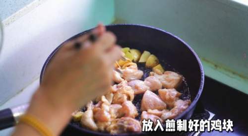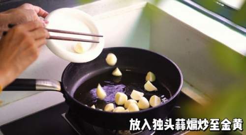 - 9锅中放入色拉油,放入独头蒜炒至金黄