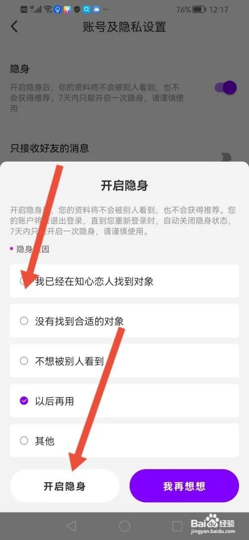 弹出下面的页面,然后选择隐身缘故原由,再点击【开启隐身】即可。