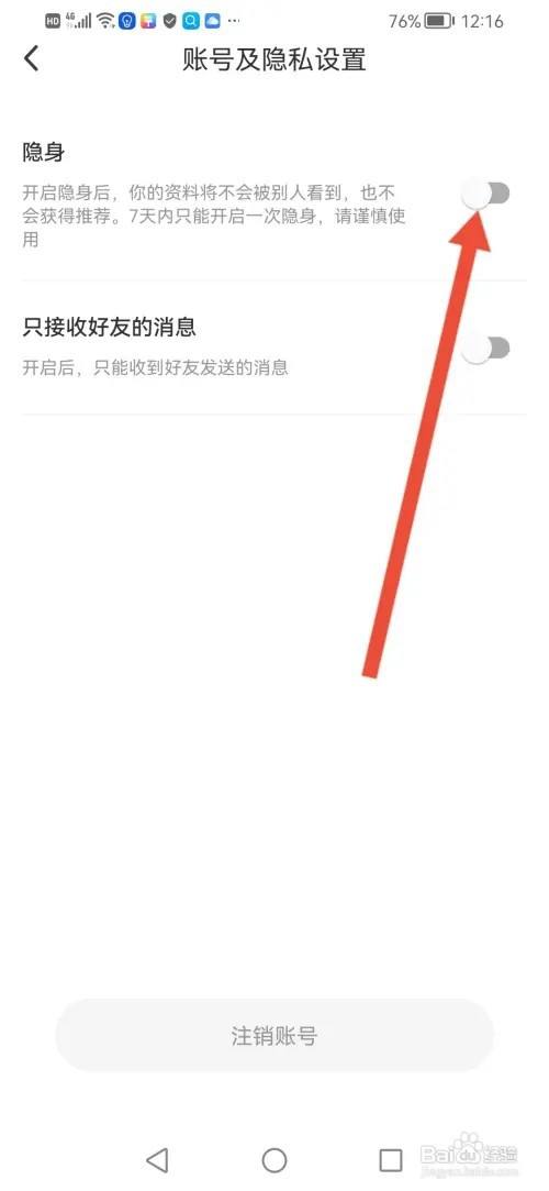 来到账号及隐私设置,然后把【隐身】的按钮开启。