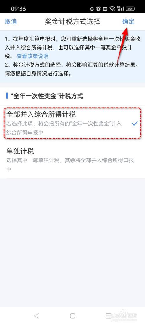 既可以选择将奖金"全数并入综合所得计税",也可以选择"零丁计税",可以两种别离选择下,选择一种更有利的方式,点击"确定"。