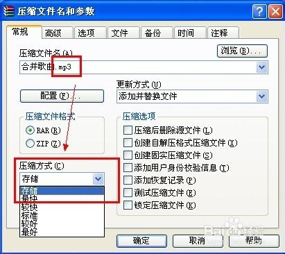 然后在压缩文件名和参数中的压缩文件名把后缀rar改当作mp3,文件名可以随便更改,另有下面的压缩方式把尺度改当作存储,然后确定就行。