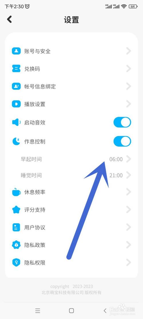 歇息节制开关打开后,点击下方的夙起时间,打开夙起时间设置页面。