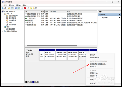 右键点击要修改的磁盘并点击更改驱动器和路径