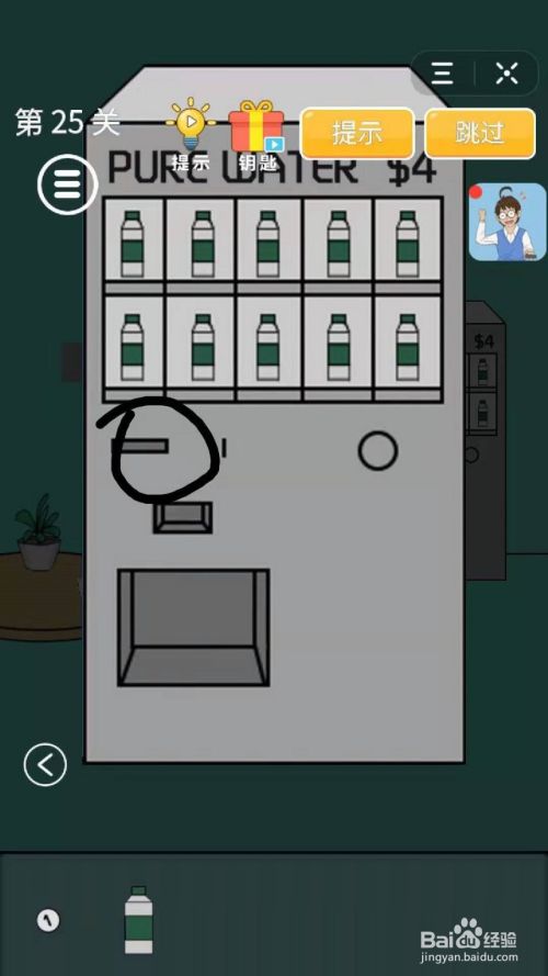 第25关,点击桌子,点击5美元。然后点击贩货机,将5美元拖到进币口处,然后会获得1美元和1瓶饮料。将饮料拖到桌子上的那张纸上,呈现密码。点击门阁下的密码锁,将1美元别离放到四个螺丝上,最后输入适才的密码。