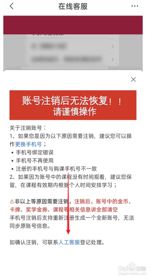 进入到新界面,点击界面底部的账号刊出请接洽在线客服选项。