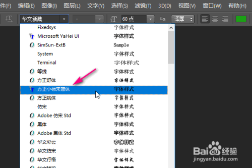 7、打开ps,在字体下拉菜单中即可看到新加的字体了