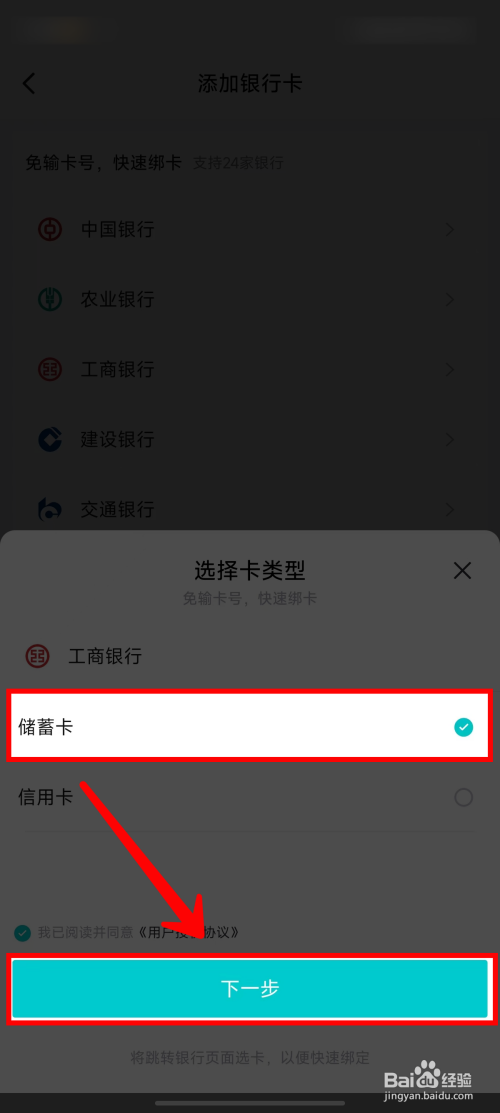然后鄙人方弹出的窗口中,选择银行卡类型,再点击【下一步】即可完当作主动添加。