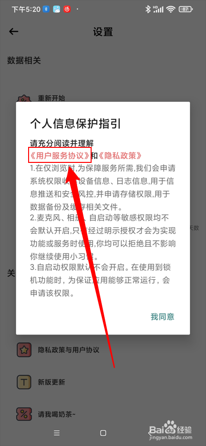 点击设置中的"隐私政策与用户和谈"进入个人信息掩护指引窗口;