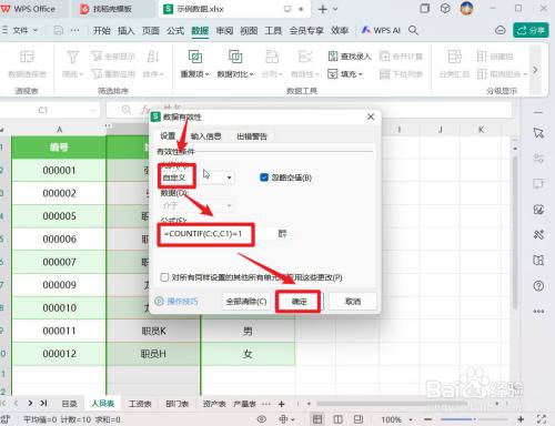 第三步,选择【有用性前提】为"自界说",【公式】为"=COUNTIF(C:C,C1)=1",点击【确定】按钮完当作设置。