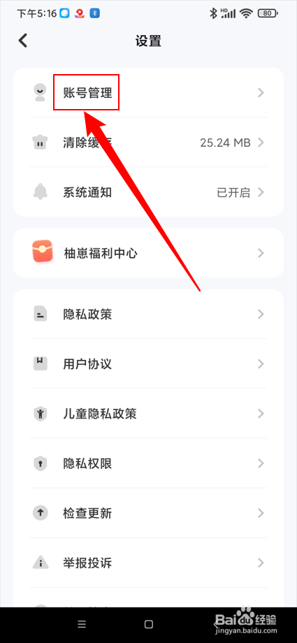 点击设置中的"账号办理";