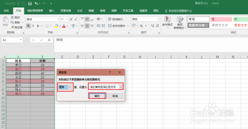 此刻会看到如下窗口,左侧第一个窗口有两个选项"反复"和"独一",选择"反复",右侧选择标志反复数据的颜色,接着点击"确定"。