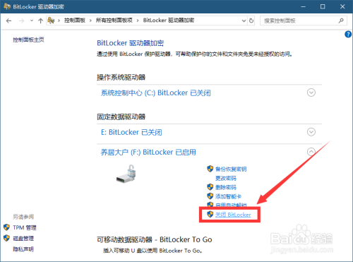 封闭BitLocker乐成后,磁盘(F:)显示:BitLocker已封闭