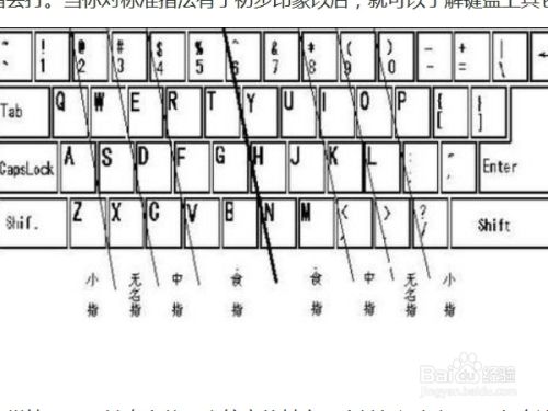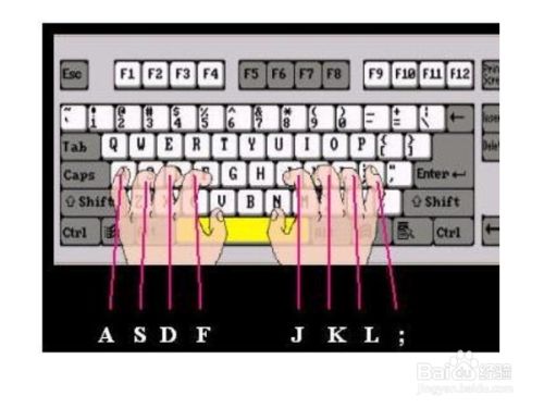 - 1所谓尺度指法就是把您的双手依照下图的位置放在键盘上,即让您的左手食指放在字母F上(F键上有一个小突起,我们凡是称之为盲打坐标),右手食指放在字母J上(J键也有一个盲打坐标)然后将四指并列对齐别离放在相邻的键钮上。
