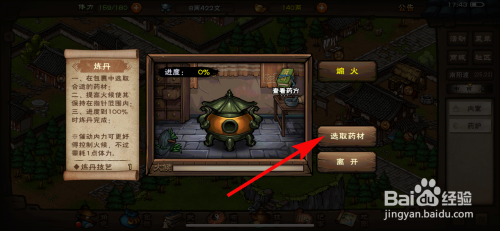 工具/原料iPhone14ios17.5烟雨江湖1.124方法/步骤1进入烟雨江湖的界面在回春药堂中找到药炉,2在炼丹炉的信息点击炼丹,3进入的页面点击拔取药材,4进入请选择道具的页面找到白芍和金银花,5随后在页面点击煽火按钮,6在炼制的时辰要节制火候进度到100即可炼制软筋散解药。END
