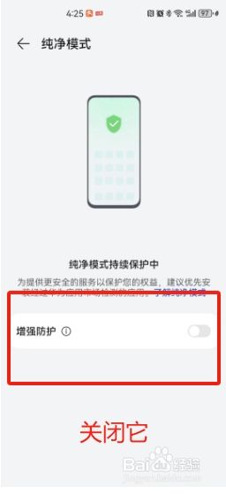 第四步:打开纯净模式后,呈现加强防护,封闭,如图所示