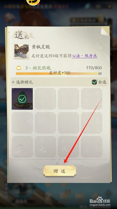 工具/原料华为P60HarmonyOS4.0常人修仙传人界篇V1.3方法/步骤1点击游戏主界面的【仙缘】图标。2进入仙缘窗口,点击【黄枫灵鲲】进口。3进入详情窗口,点击【前去送礼】按钮。4在对话框中点击【送礼】按钮。5选择礼品点击【赠予】按钮。6点击可领取的道具图标即可领取奖励。END