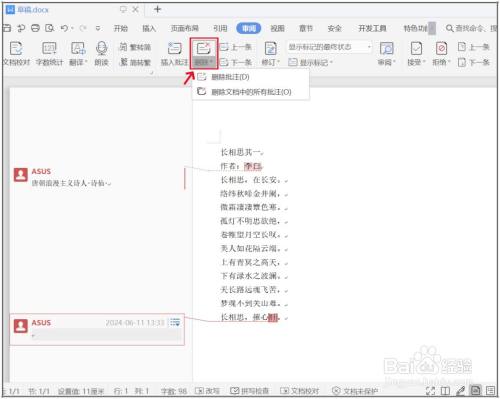 删除全数讲明就打开"核阅-删除",鄙人拉菜单里"删除文档中的所有讲明"即可。