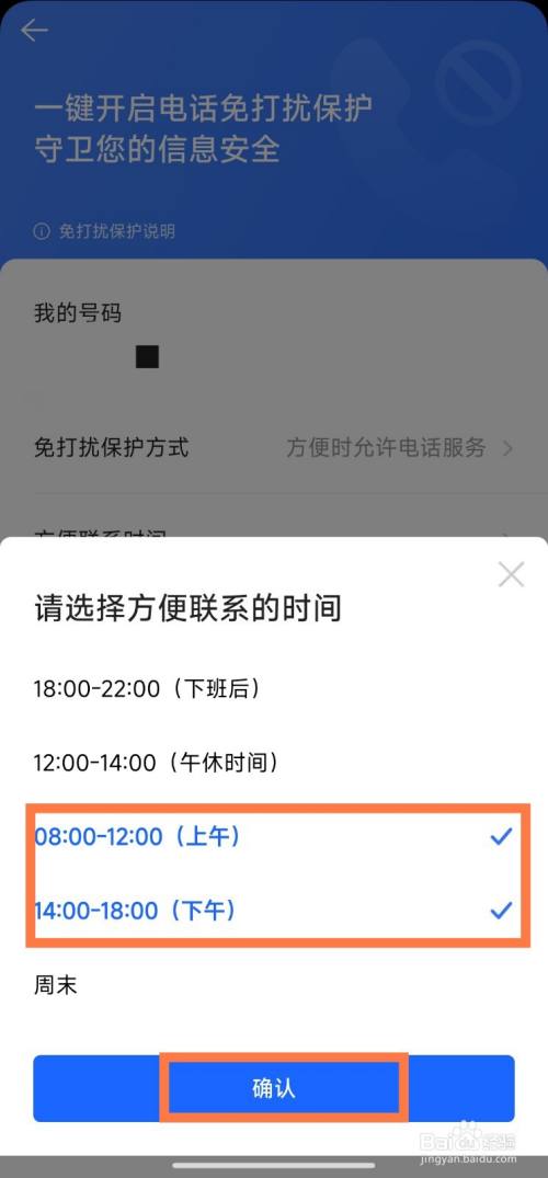 第4步:进入免打搅设置页面,点击【方便接洽时间】,弹出窗口中选择时间段,点击确定按钮。如图所示。