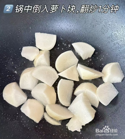 锅中倒入萝卜块,翻炒1分钟