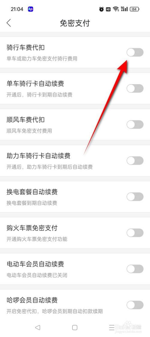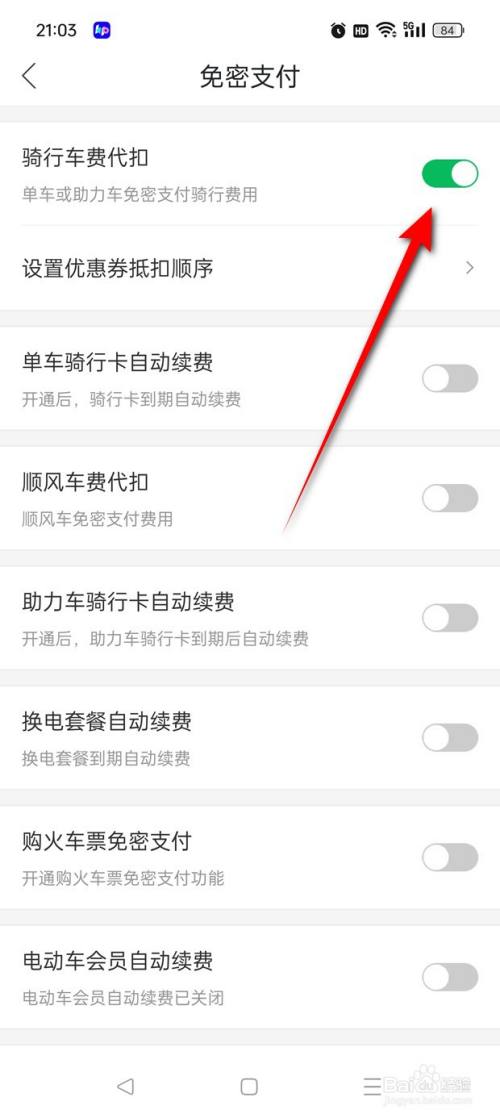将"骑行车资代扣"旁处于点亮状况的小滑块。