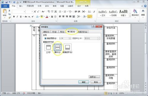 第 5步:这时会发明一个"表格属性"的小窗口,如图,依次选择"单位格"-->"居中"-->"确定"。
