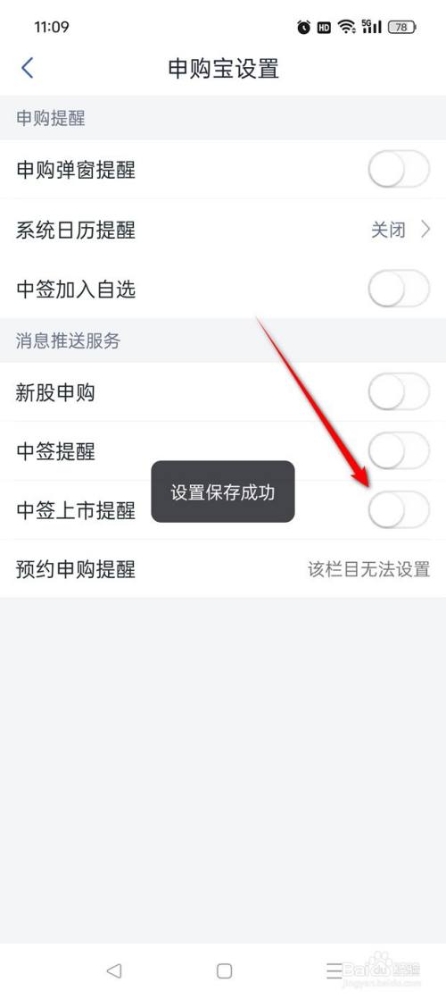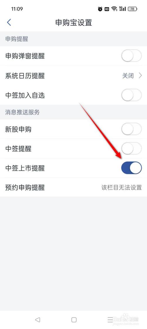 将"中签上市提示"旁的小滑块点亮即可开启。