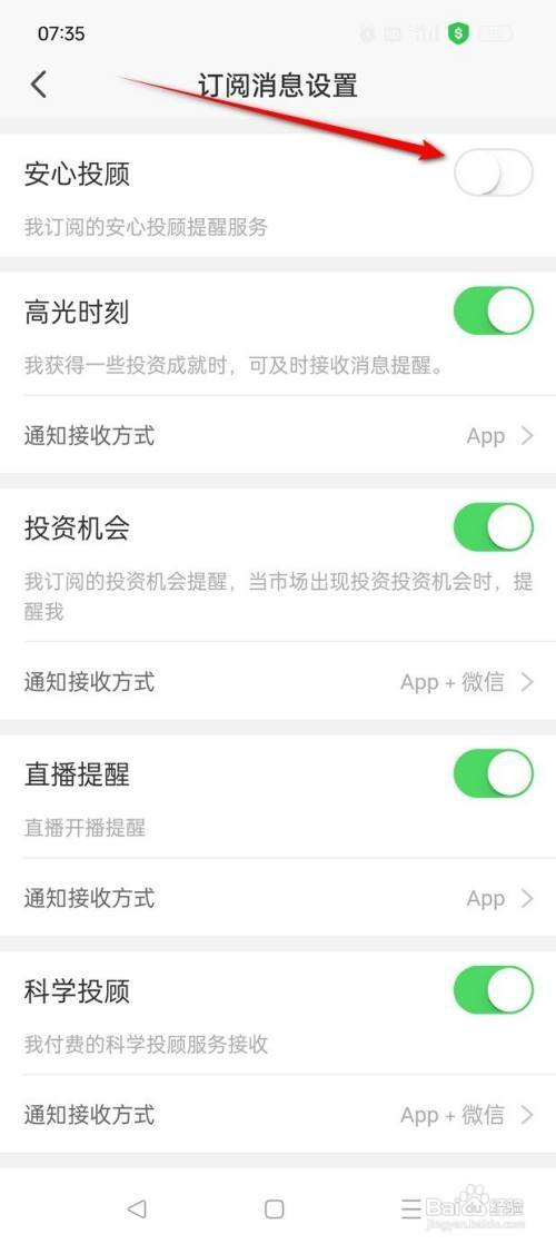 将"放心投顾"旁的小滑块点亮并完美通知吸收方式即可开启,此时点击小滑块。