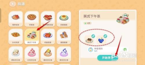 点选"英式下午茶"食谱,准备提拉米苏及果酱材料各一份,点击"开始烹饪"。