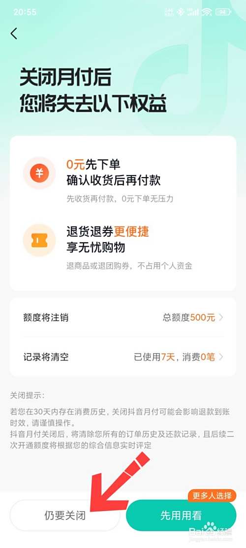 紧接着选择轻点仍要关闭,这样就关闭抖音月付成功。