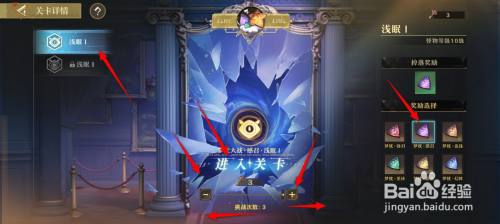 点选关卡难度,设置挑战次数,选择掉落奖励,点击"进入关卡"。