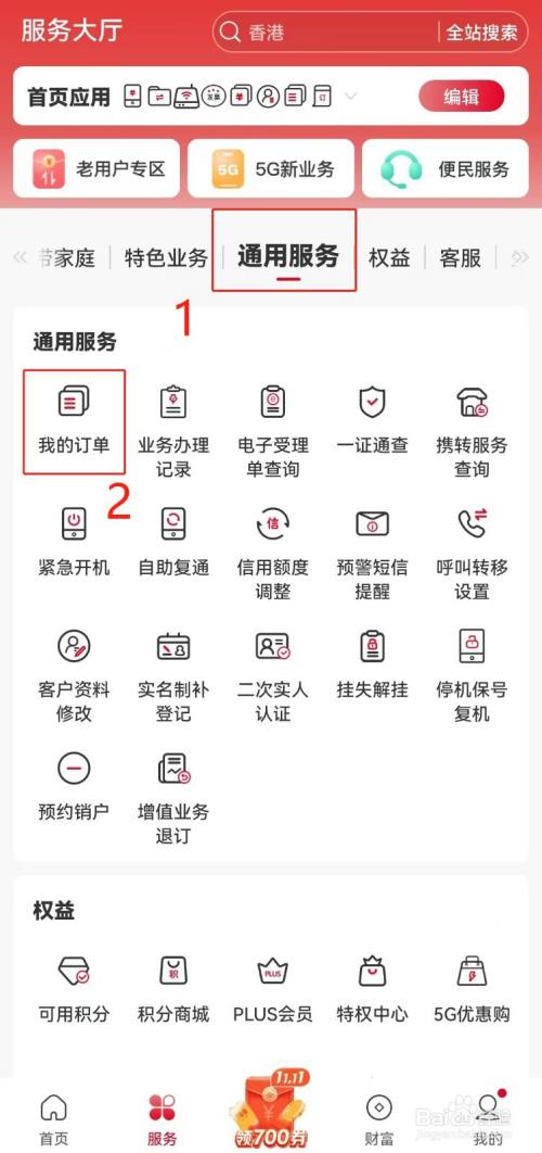 第三步:向左滑动上方导航栏,找到并点击【通用服务】,在下方找到并点击【我的订单】;