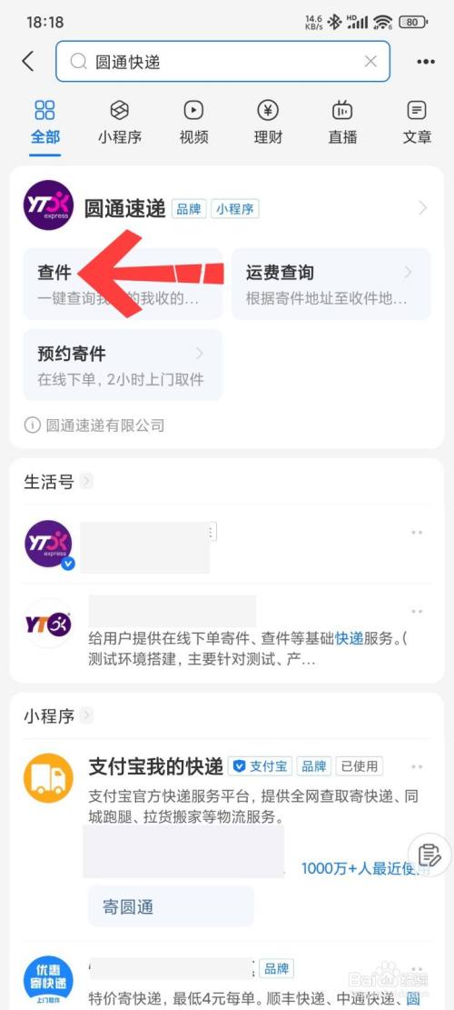 然后在搜索界面,输入圆通快递,接着选择单击查件。
