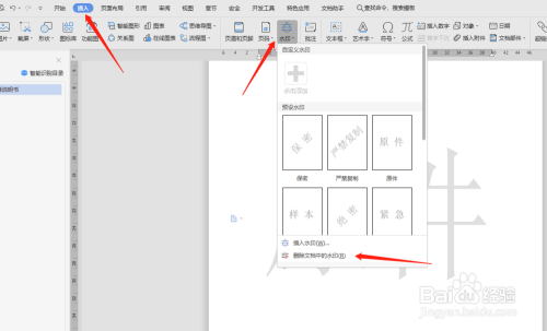 三、水印的删除区别页眉和页脚,需要在导航栏插入中找到水印,删除文档中的水印才可完成。