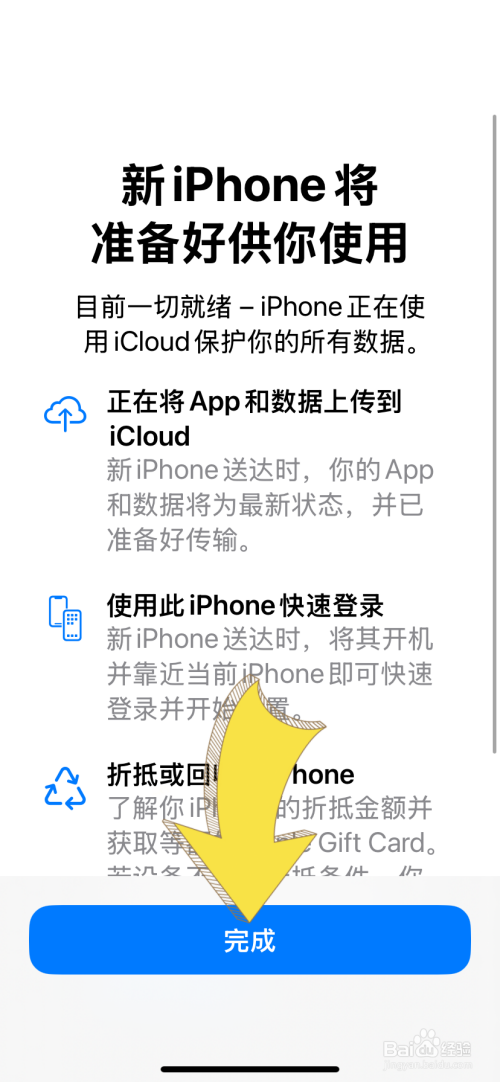 最后点击完成按钮,即可将所有数据备份到iCloud中,新手机登录同一个ID即可实现传输。