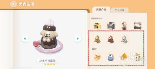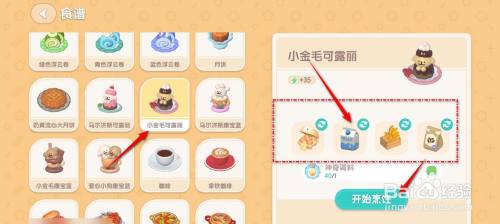 点选"小金毛可露丽"食谱,准备足够的食材,点击"开始烹饪"。
