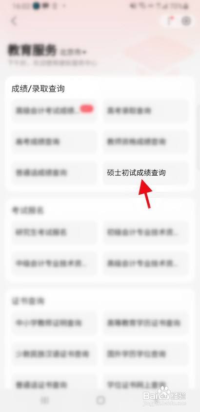 进入更多服务找到成绩/录取查询,点击上面的硕士初试成绩查询选项。