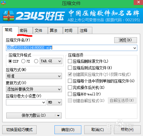 选择添加到压缩文件即可进入压缩文件界面,默认会进入简约界面,可以看到右侧有设置密码的选项,选中它。