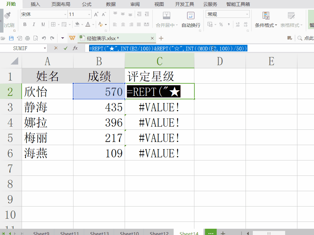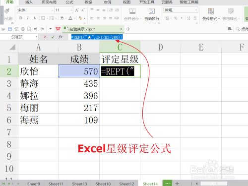 在“星级评定”列中输入函数公式“=REPT("★",INT(B2/100))”。