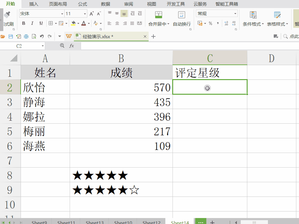 如果要产生半颗星星级评定,则要把函数公式改为“=REPT("★",INT(B2/100))&REPT("☆",INT((MOD(B2,100))/50))”,就可以生成带有半颗星的星级评定,如生成五星半、四星半、三星半等。