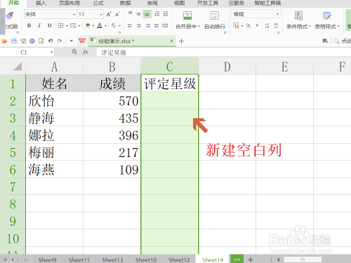 新建一列用于存放星级评定的结果,注意该列不要带任何格式,如果不确定可以插入一个空白列。