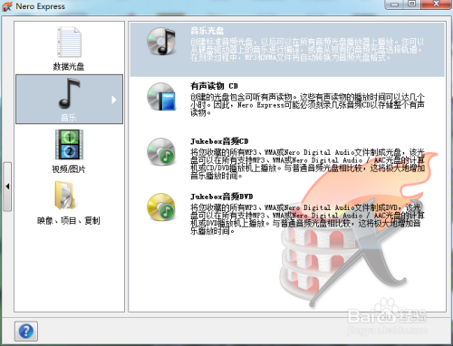 打开刻录软件,选择音乐,选中音乐光盘。