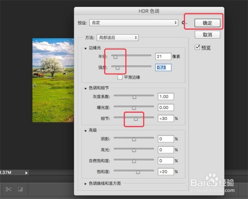 弹出HDR色调窗口,细调一下图示的几个参数,或直接就用默认参数,点击右上的‘确定’按钮。
