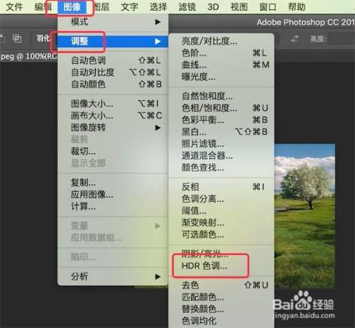 点击菜单栏上的‘图像’-->‘调整’-->‘HDR色调’