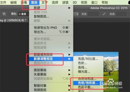 再点击菜单栏上的‘图层’-->‘新建调整图层’-->‘色相/饱和度’