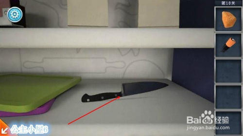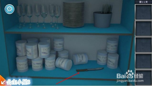 点击 如图上部分,收取一把刀,用刀将面包切片。备用。点击右侧上方蓝色柜子,打开后收取一个红色开关。