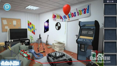 点击红色沙发底部,收取一个灯泡。将灯泡安装到第一个灯上,得到一把钥匙。