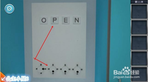 再点击柜子,选择上方蓝色部分,输入3825密码,柜子开了,调整底下的圆钮,将上边的四个方块调整为英文OPEN,门关,过关!
