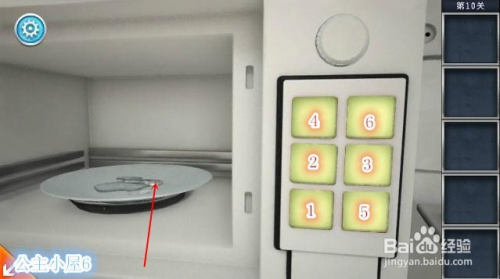 点击微波炉部分,将冰块放入其中,将开关部件安装上,再按下图所示点击各个按钮。冰块融化,得到一把钥匙。