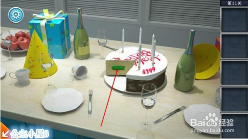点击桌子中间部分,放大后,使用刀子切块蛋糕。收取一把螺丝刀。