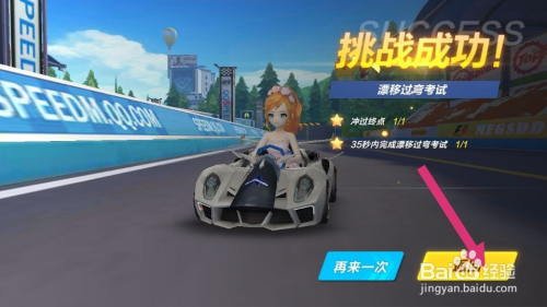第一项考试是要35秒内完成漂移过弯,一般只有没有碰撞都能过,只要有一次碰撞就很难过了,完成考试后点击返回键,如图。